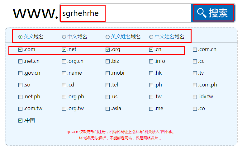 三. 输入要查询的域名类型及域名,勾选相应的后缀名,点击搜索即可反馈查询结果,显示该域名有无被注册及各注册商的价格