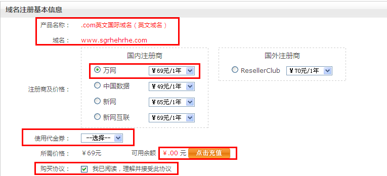 详情页面请先确认域名注册的基本信息,查看是否有代金券可使用,账户是否有足够的余额可购买域名。如果余额不足,可点击“点击充值”按钮,进行在线支付
