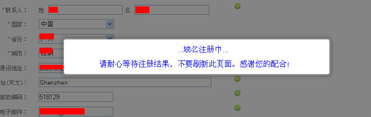 域名详情信息确认完毕后,请按照要求填写域名所有人信息,信息务必确保真实。填完信息后点击立即注册即可成功注册该域名。