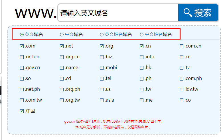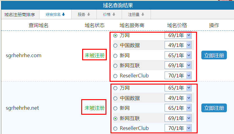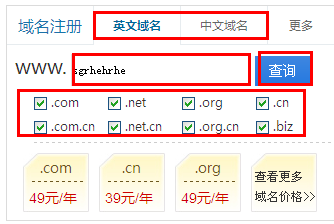 三. 输入要查询的域名类型及域名,勾选相应的后缀名,点击搜索即可反馈查询结果,显示该域名有无被注册及各注册商的价格