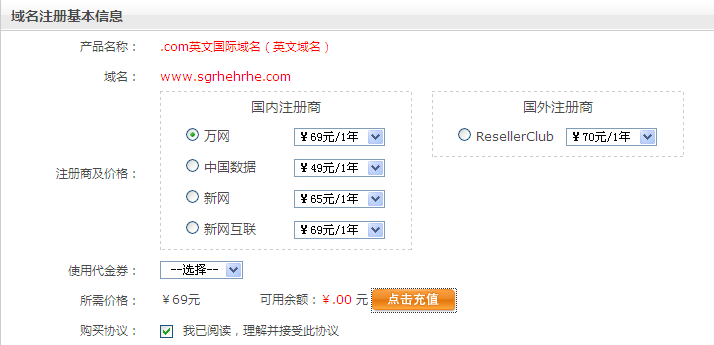 详情页面请先确认域名注册的基本信息,查看是否有代金券可使用,账户是否有足够的余额可购买域名。如果余额不足,可点击“点击充值”按钮,进行在线支付
