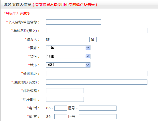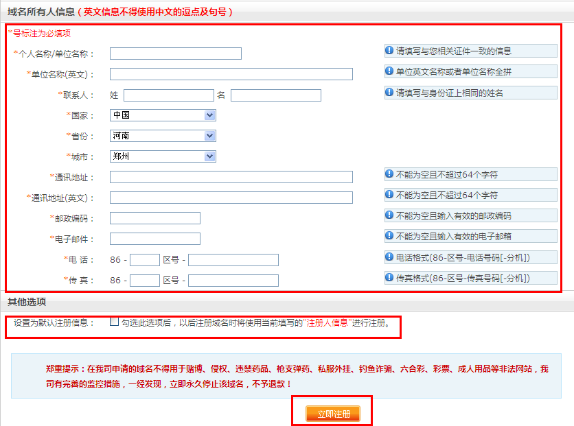 域名详情信息确认完毕后,请按照要求填写域名所有人信息,信息务必确保真实。填完信息后点击立即注册即可成功注册该域名。